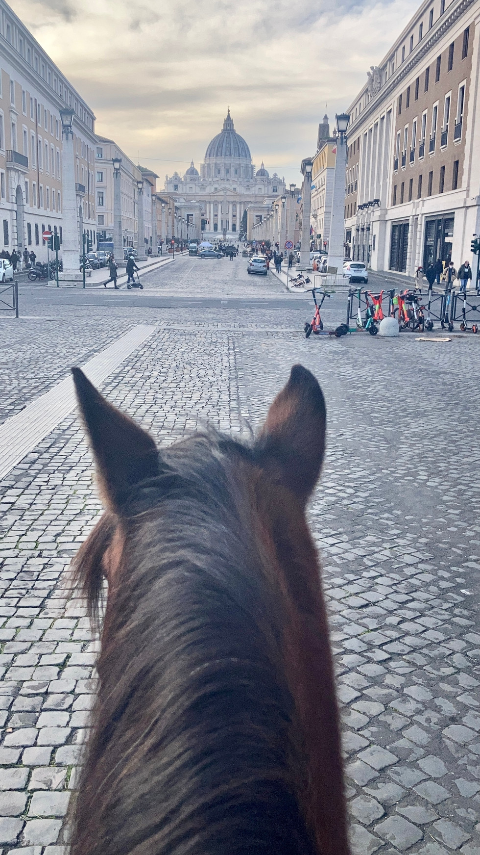 La partenza il giorno dopo si ritardò parecchio, parlando e facendo conoscenza con varie persone. Da lì passai nel Parco dell’Insugherata, che mi permise di avvicinarmi al centro della metropoli tramite piccoli sentieri nel bosco. Da lì in poi camminai sulle strade trafficate, fingendomi una bici molto molto lenta… Una volta mi capitò di sbagliare strada, e dato che era senso unico, dovetti fare tutto un lungo giro per prendere la svolta giusta. A un certo punto riuscii a trovare la pista ciclabile che mi permise di evitare il traffico peggiore. Rimasi stupita, però, da quanto bene abbia funzionato tutto. Mai ci fu una situazione difficile o pericolosa, e la gente era carinissima. A volte mi fermarono per strada, a volte mi inseguirono con le macchine per poi fermarsi accanto a me e chiedermi le solite cose. Reazioni tutte quante positive! Passare davanti al Vaticano, al Colosseo, all’antica Roma in sella al mio Bamiro e con Rhiannon e Sparta accanto fu un’esperienza unica e emozionante. Se già mi affascinano i ruderi di vecchi casali, potete immaginarvi cosa ho provato di fronte a questi monumenti antichi… Mi fermai nel maneggio dei Cavalieri dell’Appia Antica, dove incontrai Davide, che il giorno seguente mi portò a fare un giro turistico a cavallo sull’Appia Antica. Che cosa strana, vedere i residui di questa civiltà, abbandonata, a volte coperta di rovi, senza descrizioni, buttati lì nel prato, con le mucche che ci pascolano attorno…