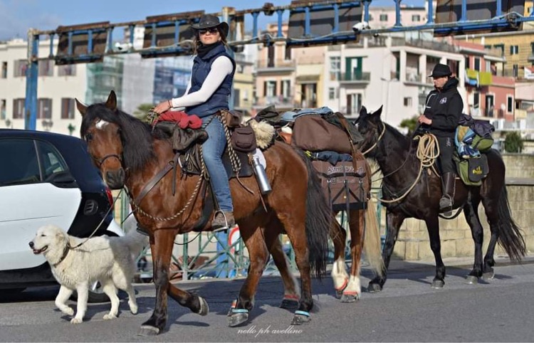 Napoli, la città del sole… ovviamente quando sono passata io pioveva. Ma mi ha colpito anche così. Mai mi sarei aspettata una città così bella! Napoli, la vera Napoli, è fantastica… Purtroppo è tutto quello attorno che le da quella cattiva fama. Anche attorno al Vesuvio: solo asfalto e città, una dopo l’altra. Per me a cavallo niente di bello. Al Vesuvio mi soffermai qualche giorno, girando a piedi sulla lava e sulle pendici del vulcano. Da lì lo aggirai sul lato interno, passando per Ottaviano e Scafati, dove mi fermai a casa di una famiglia. Proseguì attraversando San Marzano (sì il pomodoro viene da lì ;)) e mi fermai a Castel San Giorgio. Prima di Napoli avevo pensato di fare la costiera Amalfitana, ma dopo tutto quel casino di macchine, asfalto, traffico e persone volevo uscire, volevo salire in montagna e respirare l’aria fresca, volevo vedere Sparta correre nei prati, non dovermi concentrare su ogni passo dei miei cavalli. Così cambiai il percorso e mi diressi verso l’entroterra. Alla costiera mi ci portò il mio amico Giovanni quei giorni, con la macchina. Andammo a fare una passeggiata e mi riportò al maneggio Cavalieri di Castel San Giorgio. Il giorno dopo partì per Baronissi, per arrivare al centro equestre Madre Terra. Lì venni completamente stravolta… già quando arrivai c’era una festa. Durante la giornata avevano fatto delle piccole gare e c’erano tantissime persone. Mi vengono le lacrime pensando a quei momenti, perché quello fu solo l’inizio. Nei giorni seguenti venni a conoscere meglio alcune delle persone, venni accolta come una di famiglia… Sabatino, Agostino, Andrea, Rossella, Sofia, Giovanni e tanti altri si sono intrufolati nel mio cuore. Mai, mai potrò scordarmi di questi giorni passati insieme, delle emozioni, delle risate, delle lacrime…